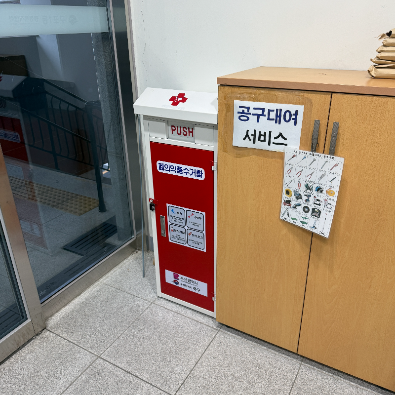 폐의약품 수거함이 안 보여서 직원분께 여쭈어보니 바깥쪽 통로?에 있다고 하셨다